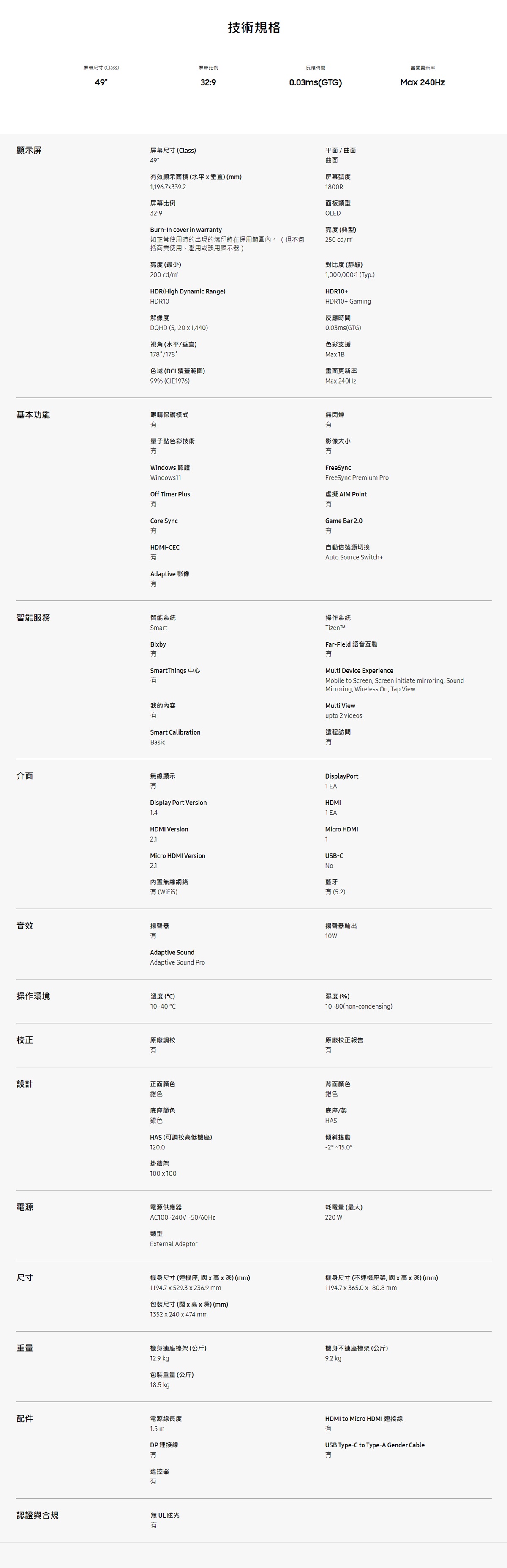 SAMSUNG - 49" Odyssey OLED G9 G95SD 曲面電競顯示器 (240Hz) LS49DG952SCXXK